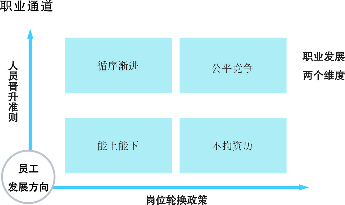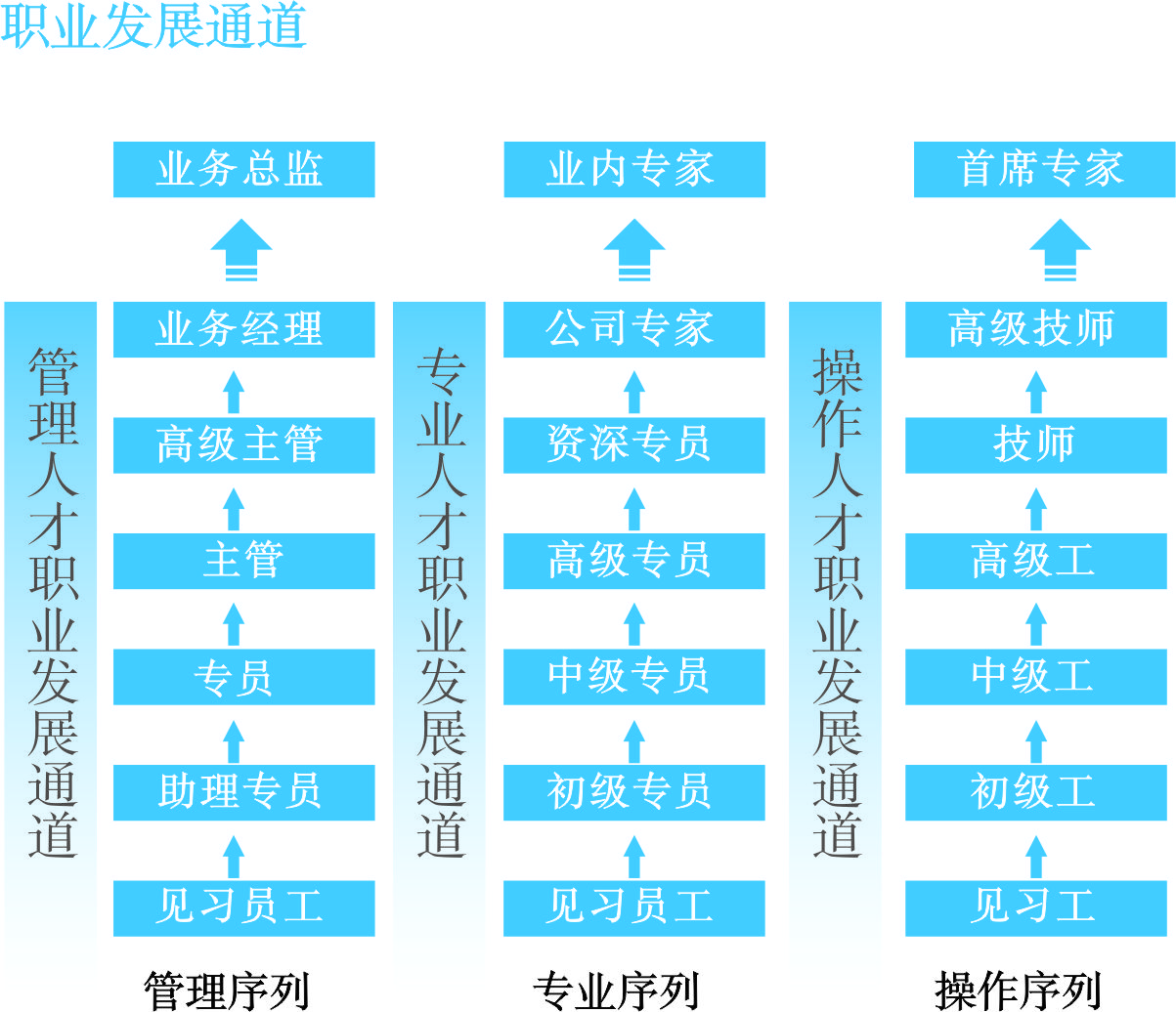 公司為員工提供多條職業(yè)發(fā)展通道,總體上劃分為管理、專業(yè)和操作三個序列。