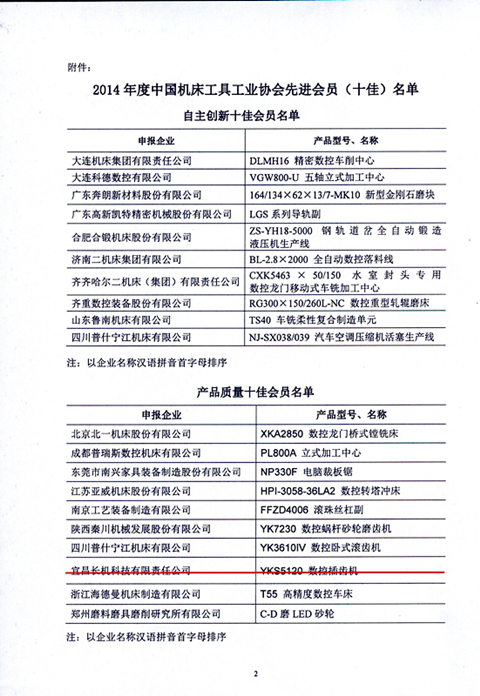 宜昌長(zhǎng)機(jī)科技獲中國(guó)機(jī)床工具工業(yè)協(xié)會(huì)2014年度“產(chǎn)品質(zhì)量十佳會(huì)員”榮譽(yù)