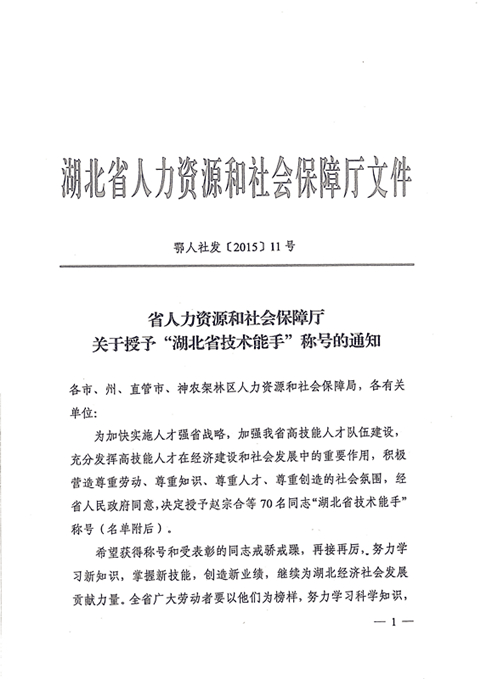 熱烈祝賀宜昌長(zhǎng)機(jī)科技公司王濤同志獲湖北省技術(shù)能手榮譽(yù)稱號(hào)