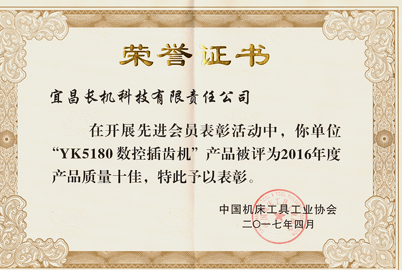 公司YK5180數(shù)控插齒機(jī)被中國機(jī)床工具工業(yè)協(xié)會評為2016年度產(chǎn)品質(zhì)量十佳。(責(zé)任編輯:丁業(yè)超)