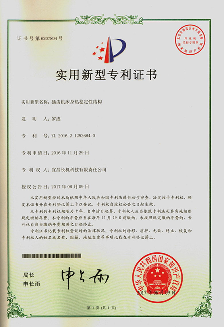 宜昌長(zhǎng)機(jī)科技公司“插齒機(jī)床身熱穩(wěn)定性結(jié)構(gòu)”、“一種發(fā)動(dòng)機(jī)殼體自動(dòng)抓取的手爪結(jié)構(gòu)”、“一種適合多品種汽車轉(zhuǎn)向器齒條活塞銑齒加工用夾具”獲實(shí)用新型專利,