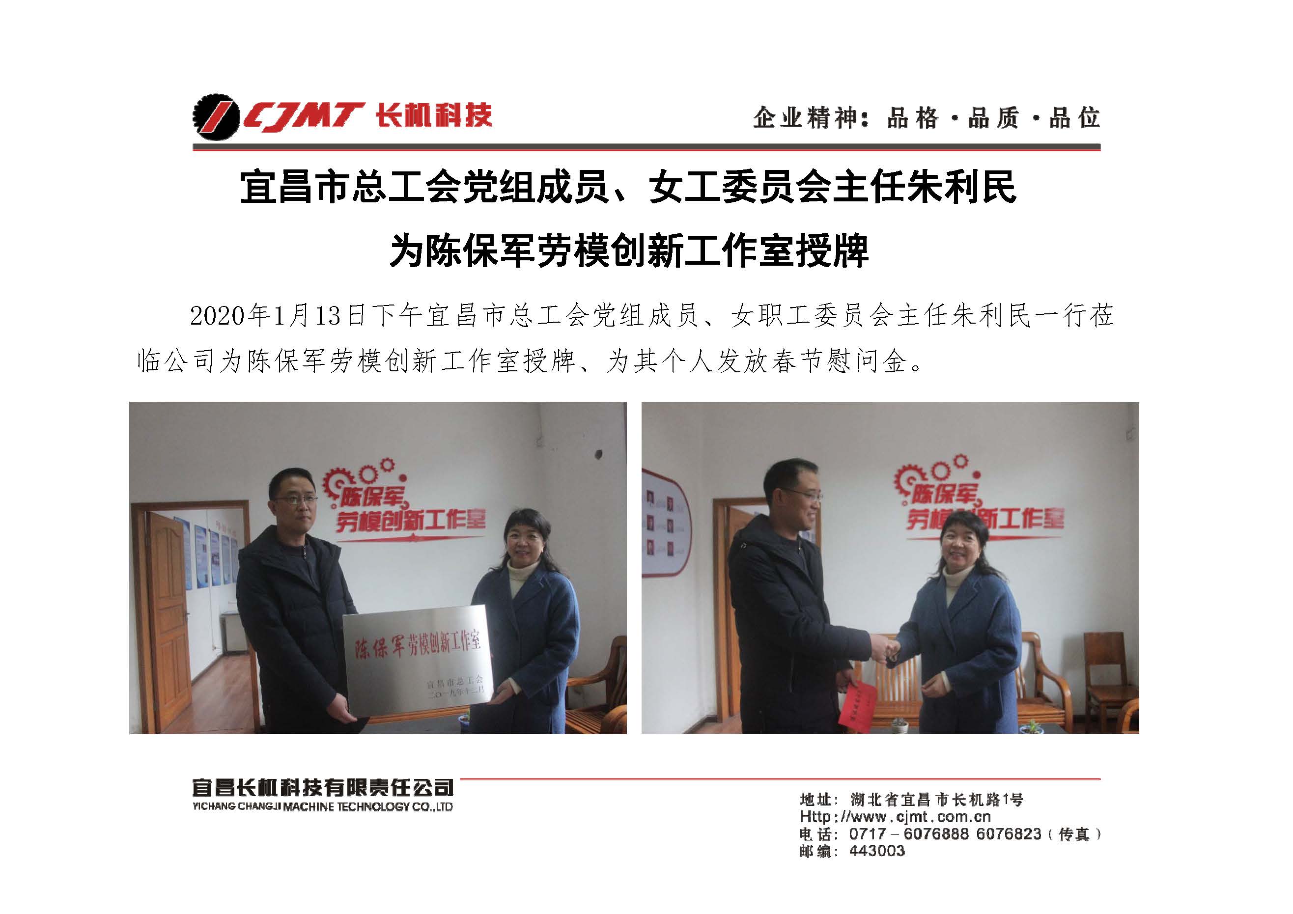 宜昌市總工會黨組成員、女工委會主任朱利民為陳保軍勞模創(chuàng)新工作室授牌