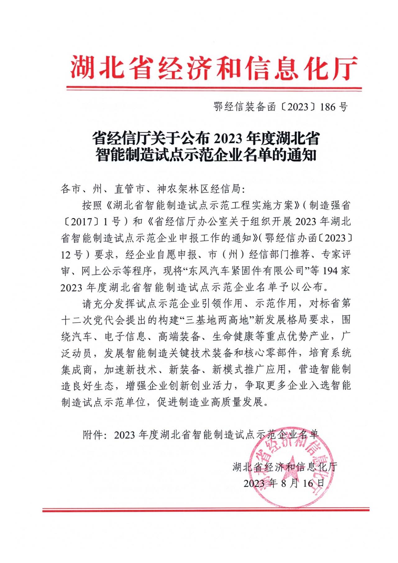 我公司獲評2023年度湖北省智能制造試點示范企業(yè)